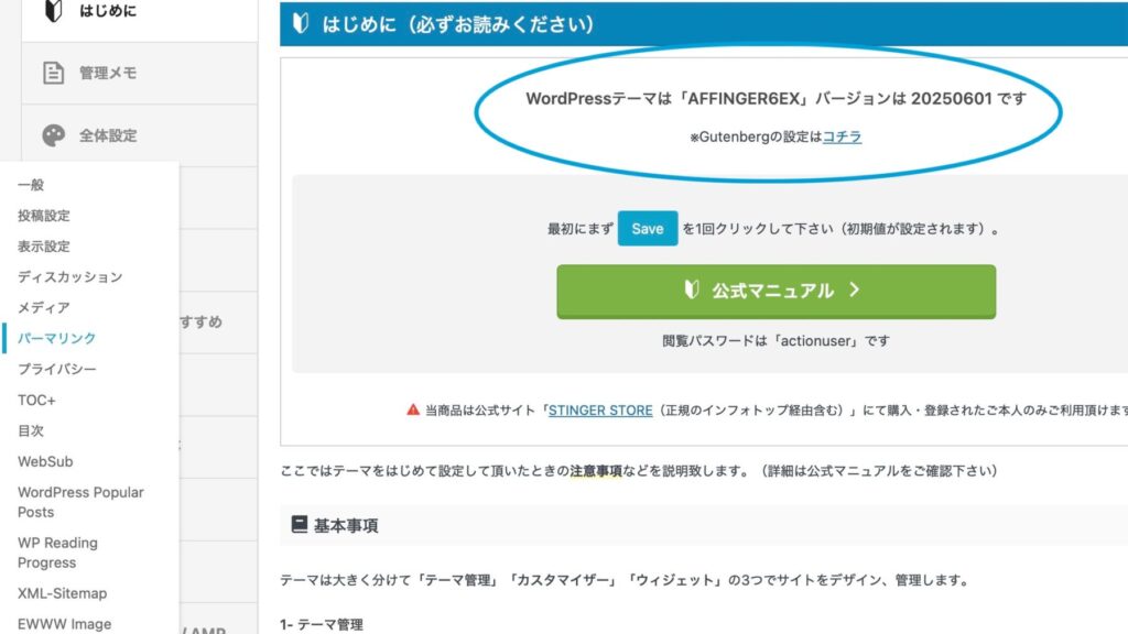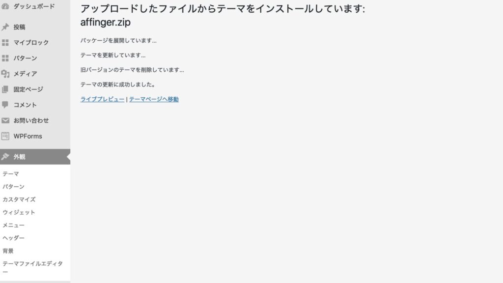 「WordPressテーマは「AFFINGER6EX」バージョン〇〇です」と表示されたら、無事アップグレード完了。