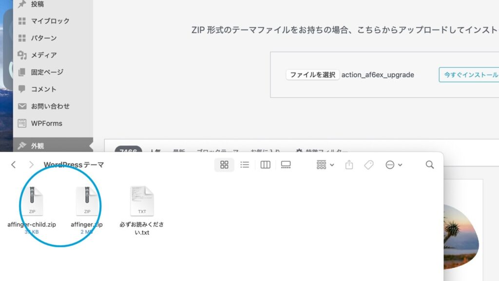 ダウンロードしたファイルを開き、「action_af6ex_upgrade.zip」をワードプレスにアップロードする。WordPressの管理画面から「外観」→「テーマ」→「テーマのアップロード」