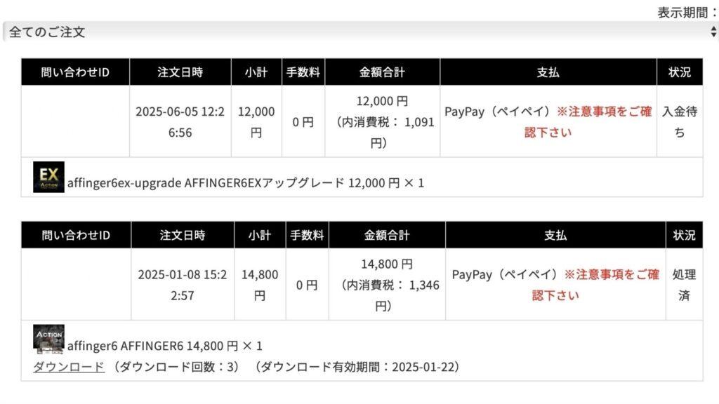 ↓ 購入履歴に進むと、状況が「入金待ち」の状態。これで大丈夫。