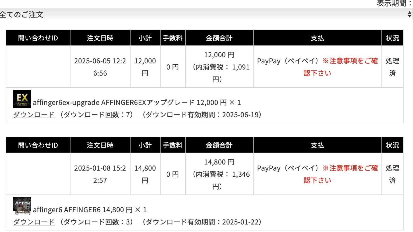 ↓ しばらくすると「入金待ち」が「処理済」と表示される。