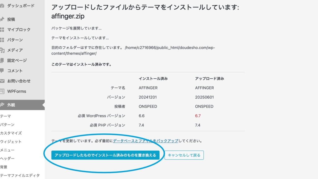 「アップロードしたものでインストール済みのものを置き換える」をクリックする。