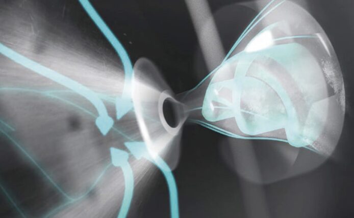 2本の水流を吐出後に衝突させることでスクリュー状のねじれた水流が発生させる。
