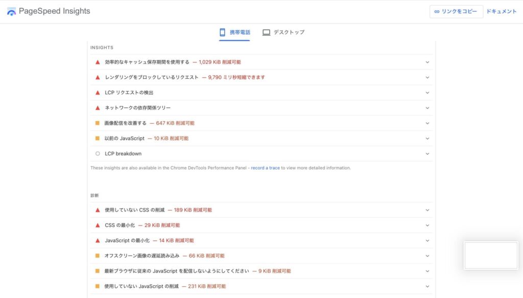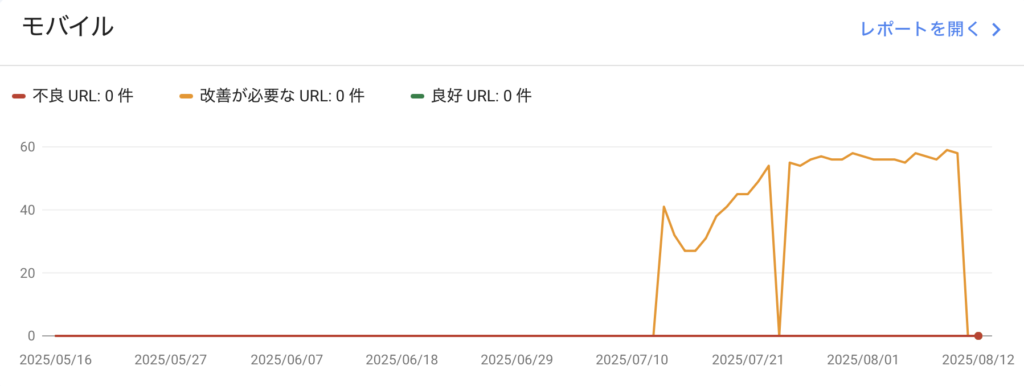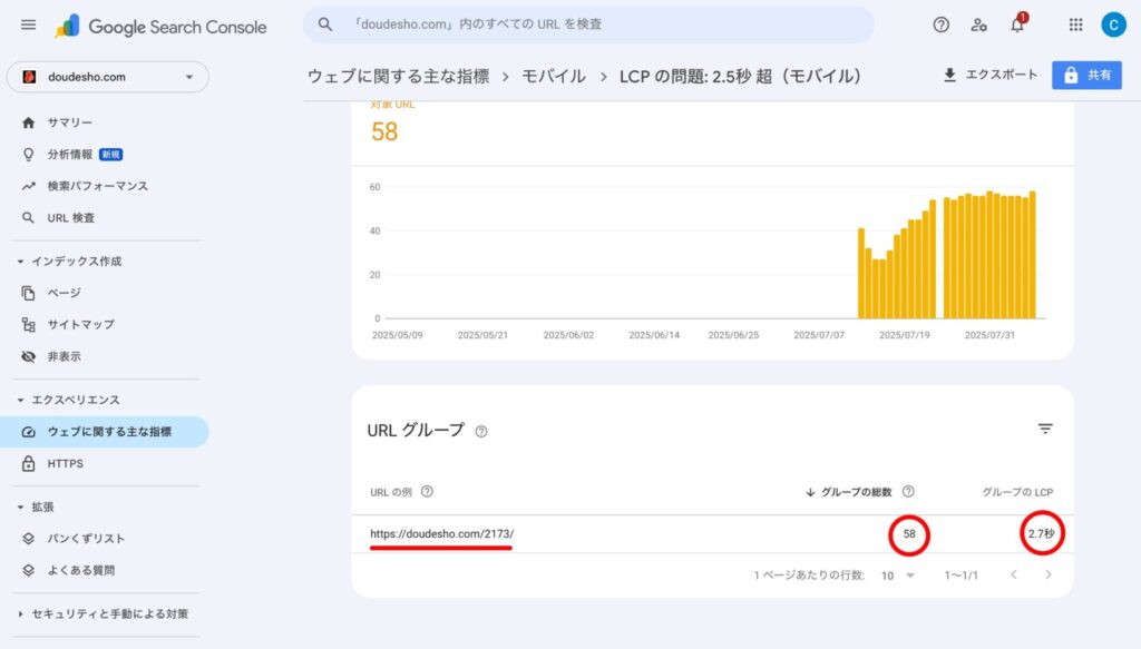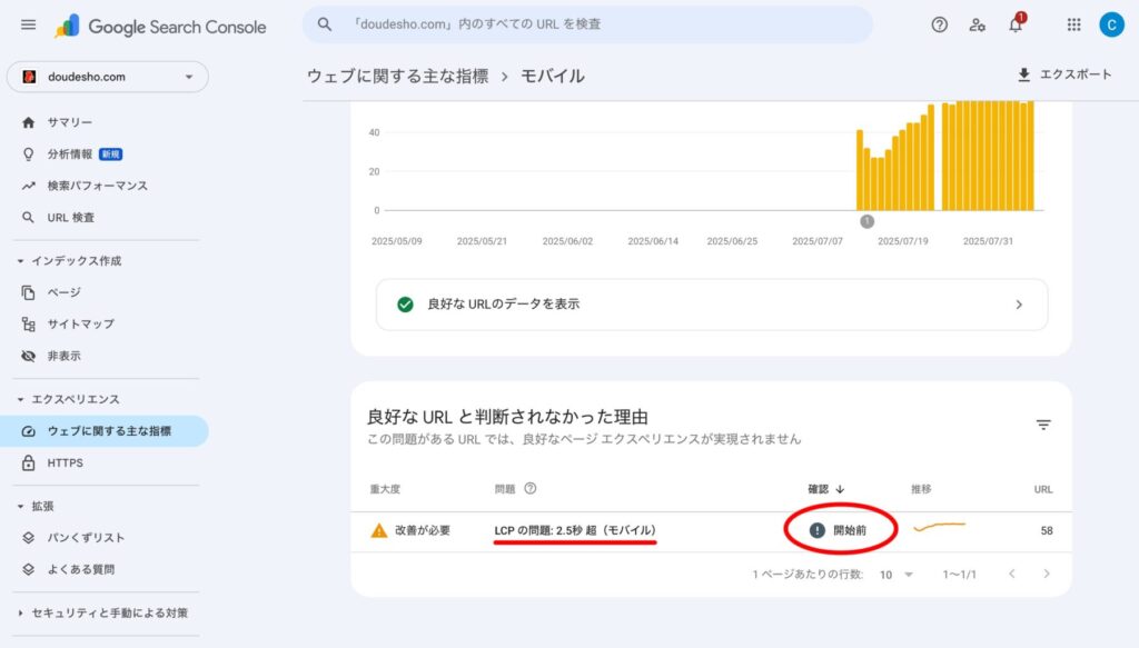 サイトやページの表示に2.5秒以上かかると、「LCPの問題:2.5秒超(モバイル)」と表示されるようだ。