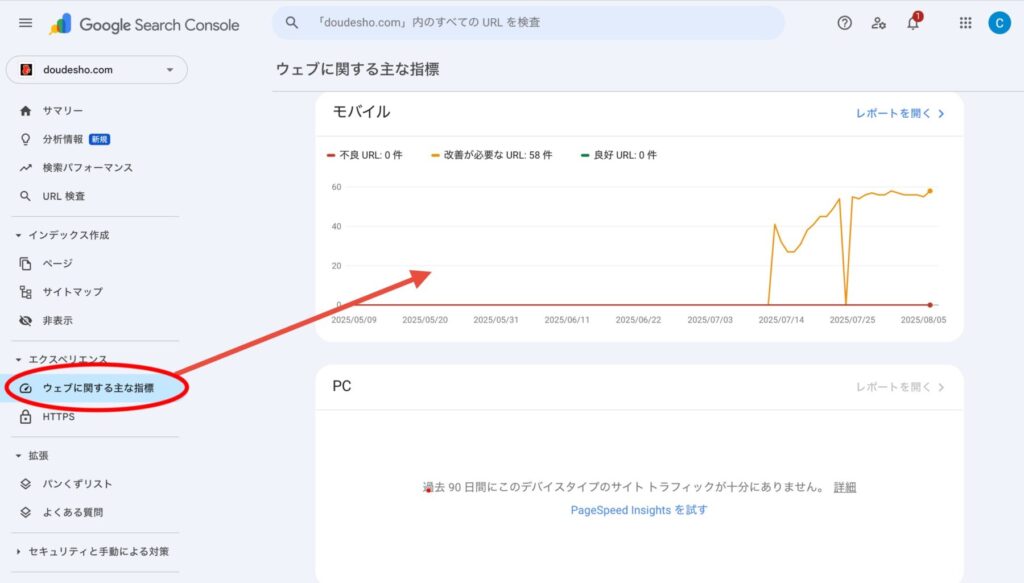 詳しい原因を調べるためにはGoogleサーチコンソールのエクスペリエンス内にある「ウェブに関する主な指標」をクリック。