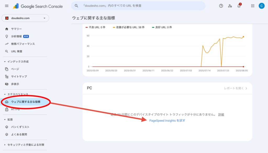 Googleサーチコンソールのエクスペリエンス内「ウェブに関する指標」から、今度はモバイルの下に表示されているPCの「Page Speed Insights」をクリック。