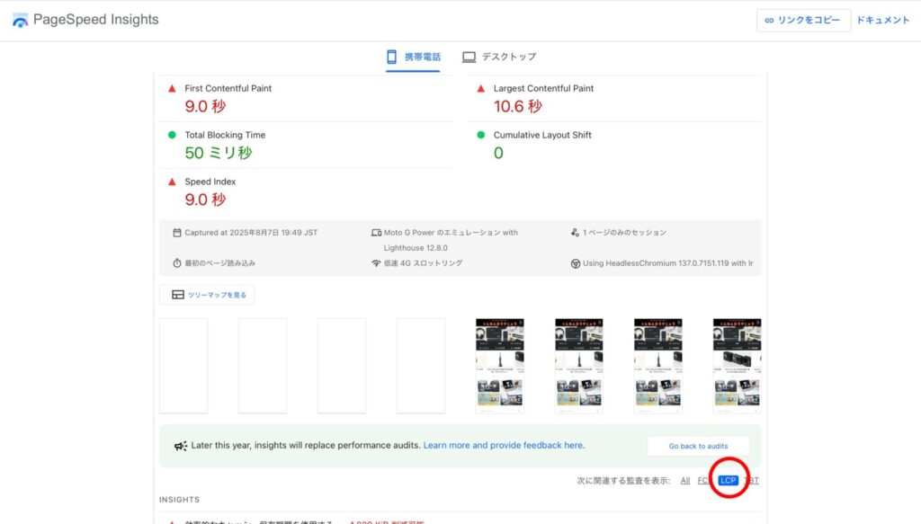 Page Speed Insightsを下にスクロールしていくと、右下に小さく「LCP」と表示されてるので、こちらをクリック。