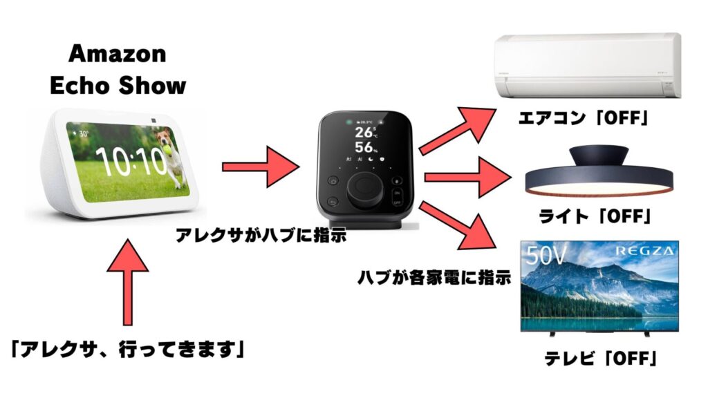 上で紹介した定型アクションはSwitchBotのハブを介して行っている。例えば「アレクサ、行ってきます」と言うと、エアコン・ライト・テレビがオフになる定型アクションを作った場合、下図のような仕組みになっている。