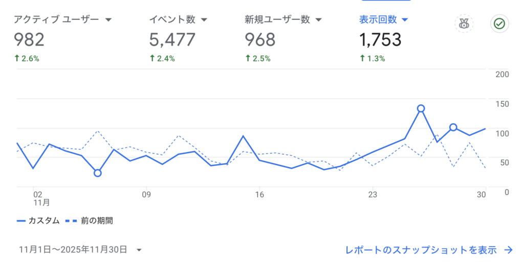 11月のPV数は1753で着地。前月と比べてもほぼ横ばいとなった。