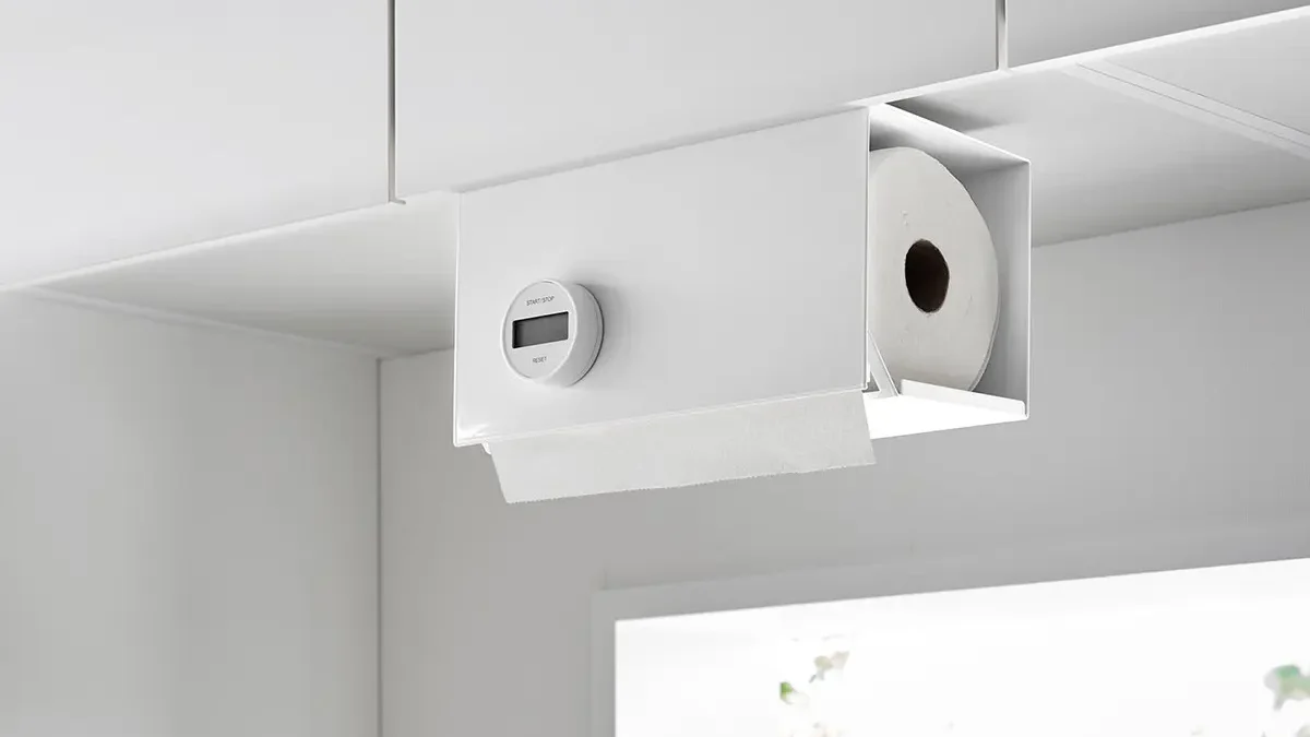 戸棚下にキッチンペーパーを収納できるもので、これはボックスタイプ。これの良いところはキッチンペーパーを片手で切れるようになってるところで、料理中で片手が汚れていても問題ない。