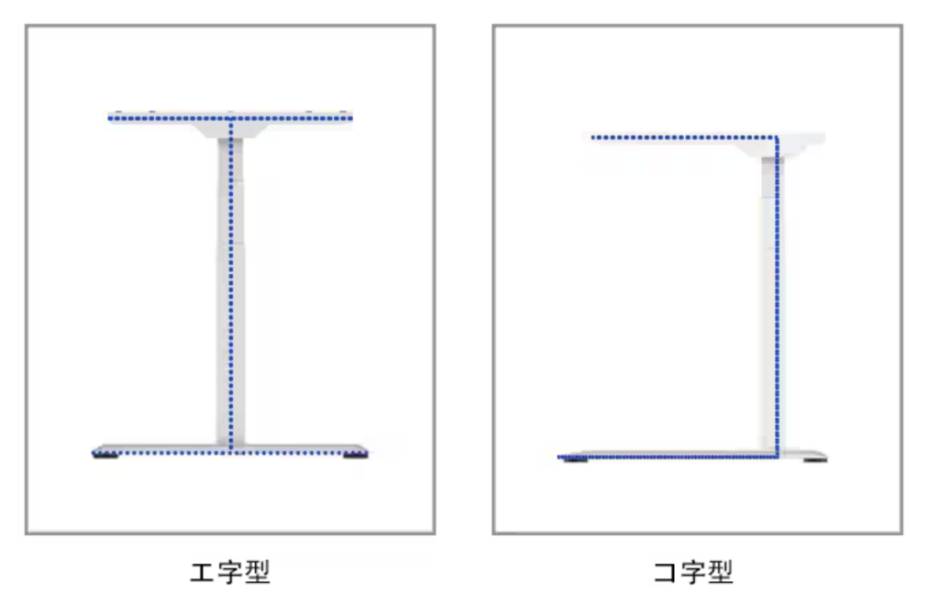 まずは脚の形状から。フレキシスポットの脚は大きく分けると2種類、「エの字型」と「コの字型」があるんだ。