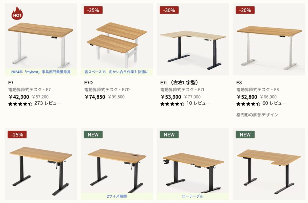 天板に関してはどちらも、フレームのみ、または天板とのセット販売で展開されている。ただしE7Hの方が天板の種類が多く、E7Proの5種類に対してE7Hは7種類から選べる。