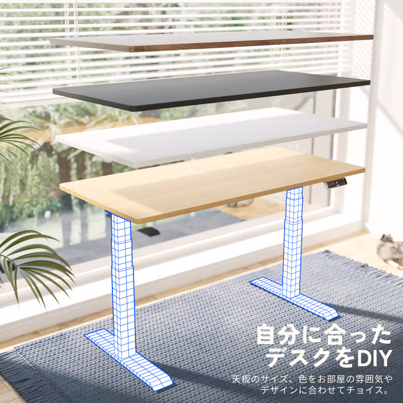 上にも書いたように、フレキシスポットはフレーム(脚)だけを購入し、好きなサイズや色の天板を使用できる。もしDIYが得意であれば費用も抑えられるし、オリジナルの電動昇降デスクを作ることができる。