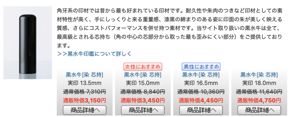 高品質な黒水牛の印鑑が3,000円台で作れたり、銀行印や角印とセットで注文できるのも魅力的。