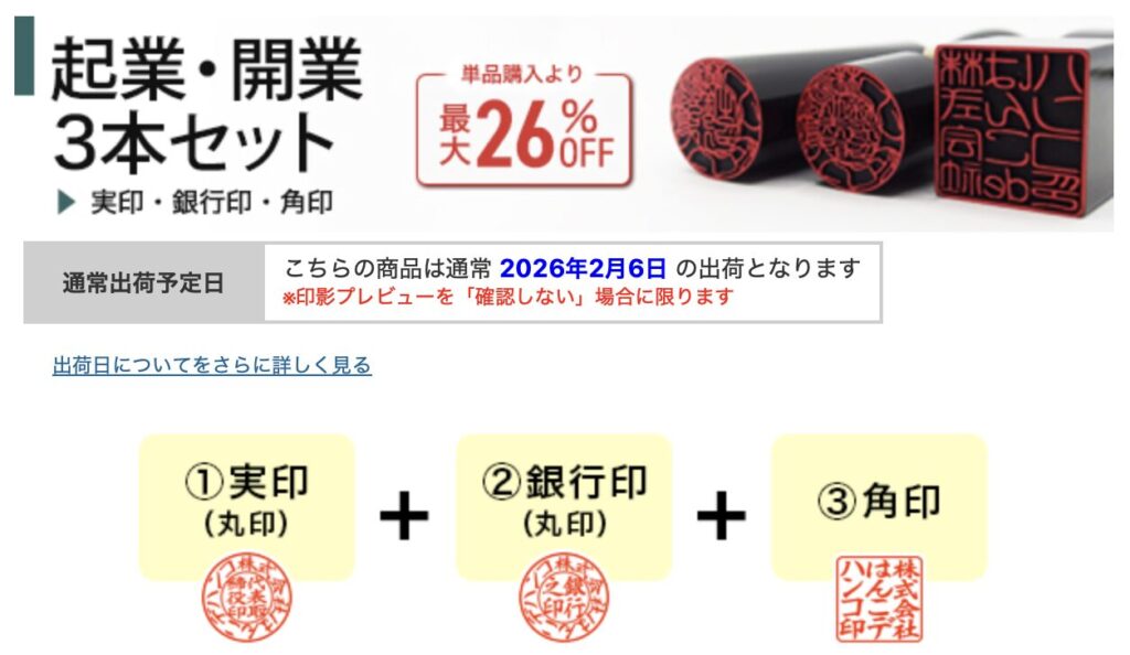 会社設立や就職祝いであれば、実印 + 銀行印 + 角印がセットになったものもあり、単品購入より最大26%オフで購入することができる。もちろん素材も選べる。